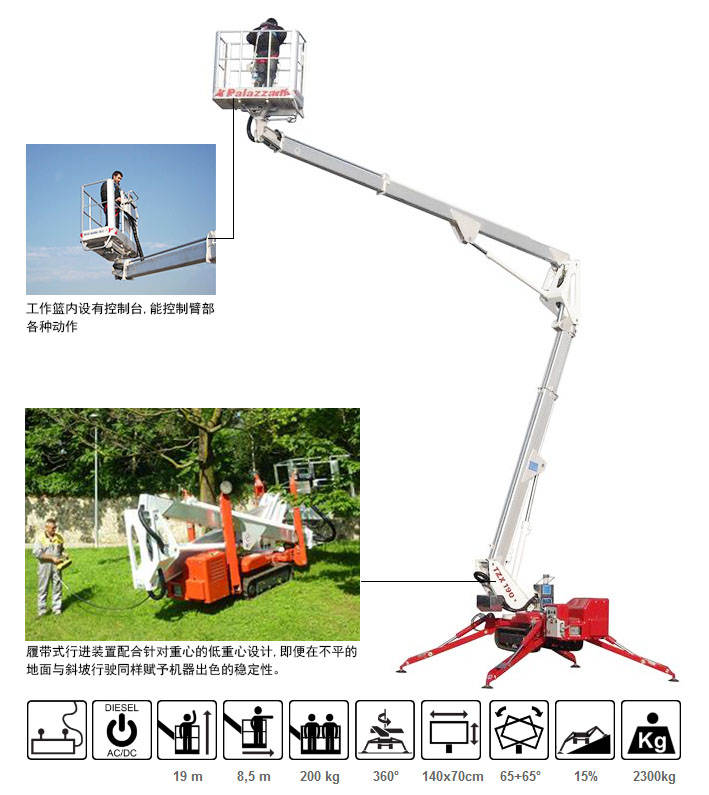 TZX190蜘蛛式曲臂高空作業(yè)車是高空作業(yè)平臺中重量較輕的伸縮臂升降平臺,其特點是自重較輕,可運用在大廈、商場、酒店等不能承受過重升降設(shè)備的場所。運用四條支腿為支撐點,支撐整個設(shè)備在升降中的平衡,體形小巧,可通過正常門框,動力為交流電、電瓶或燃油。TZX170蜘蛛車底盤可以配置履帶式和輪胎式兩種行走形式的底盤。