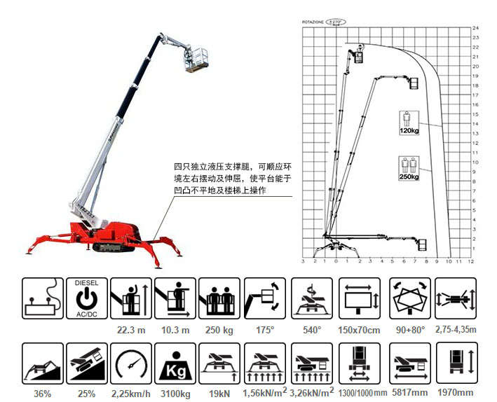 ? 各支撐腿在不同的置時(shí),升降臂橫向伸展距離也會(huì)從而受到限制,使機(jī)身保持平衡。